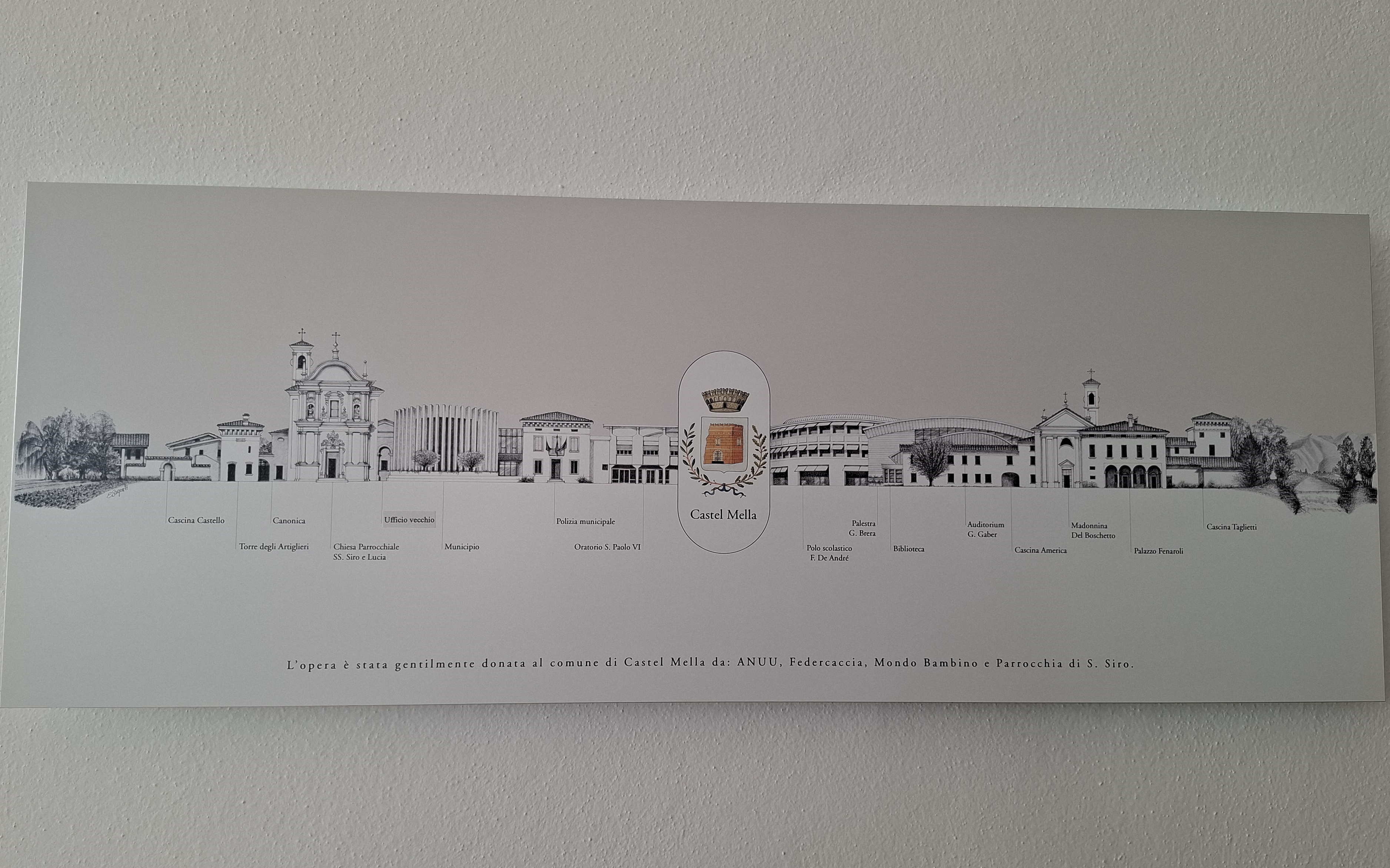 La prima parte, è il PROFILO CASTELMELLESE, uno skyline con lo stemma del Municipio calato al centro del paese, come fosse un grande stendardo stilizzato. L’opera è realizzata a grafite su cartoncino e misura cm 152x30. La seconda parte, è l’elenco dei primi cittadini che hanno amministrato Castel Mella a partire dal 1938 fino ai giorni nostri ed ai quali si è voluto rendere omaggio, grazie al contributo che essi hanno dato alla crescita della nostra comunità. In questo elenco una colonna è stata lasciata in bianco per essere compilata con i nomi dei sindaci che amministreranno il comune nel prossimo futuro. Quest’opera originale, rimarrà esposta nell’ufficio del Primo Cittadino.